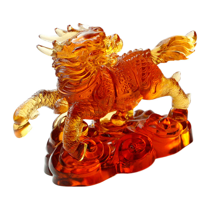 Oblik ove staklene zvijeri je realan, a svaki detalj prikazan je vrlo fino, od izraza lica zvijeri do mišićnih linija tijela i do elegantnog držanja repa, a sve to pokazuje vrhunsko umijeće majstora. Ova staklena zvijer ima topao i slojevit ton. Jantarna boja daje joj veličanstven i svečan temperament, kao da je zvijer čuvarica iz drevne legende. Staklo će prelomiti šarmantnu svjetlost pod osvjetljenjem svjetla, zbog čega ova staklena zvijer predstavlja različite vizualne efekte pod različitim kutovima, dodajući njen tajanstveni šarm.