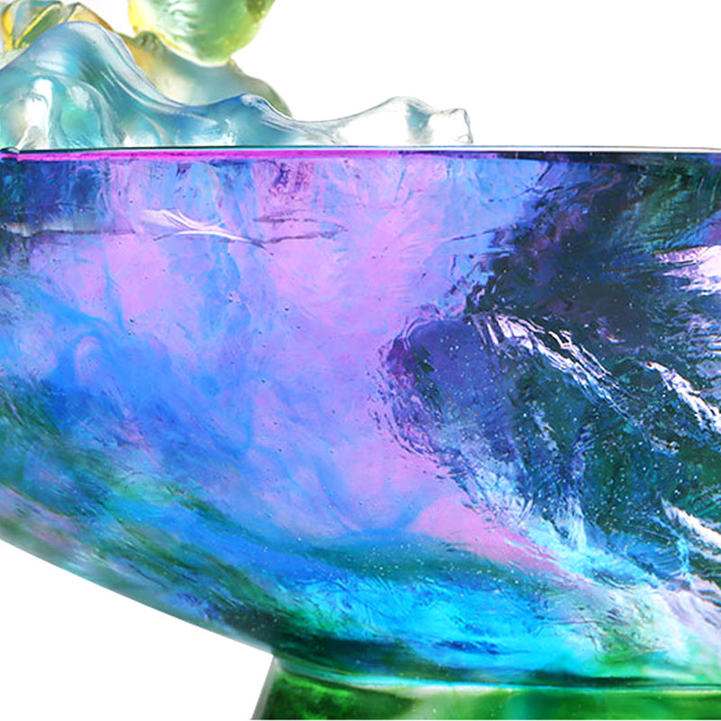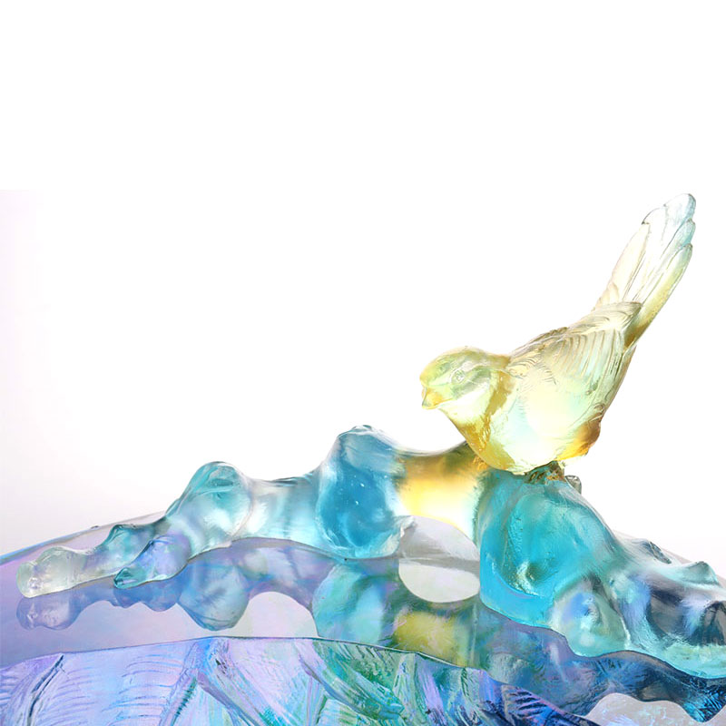 Tanjur s voćem također je ukrašen realističnim staklenim pticama i drugim staklenim predmetima, dodajući malo razigranosti i okretnosti cijelom tanjuru s voćem. Kada se u njega stave jarkocrvene bobice grožđa i okrugle jabuke, svijetle boje voća i hladni tonovi staklene ploče nadopunjuju se stvarajući vizualno skladnu ljepotu.