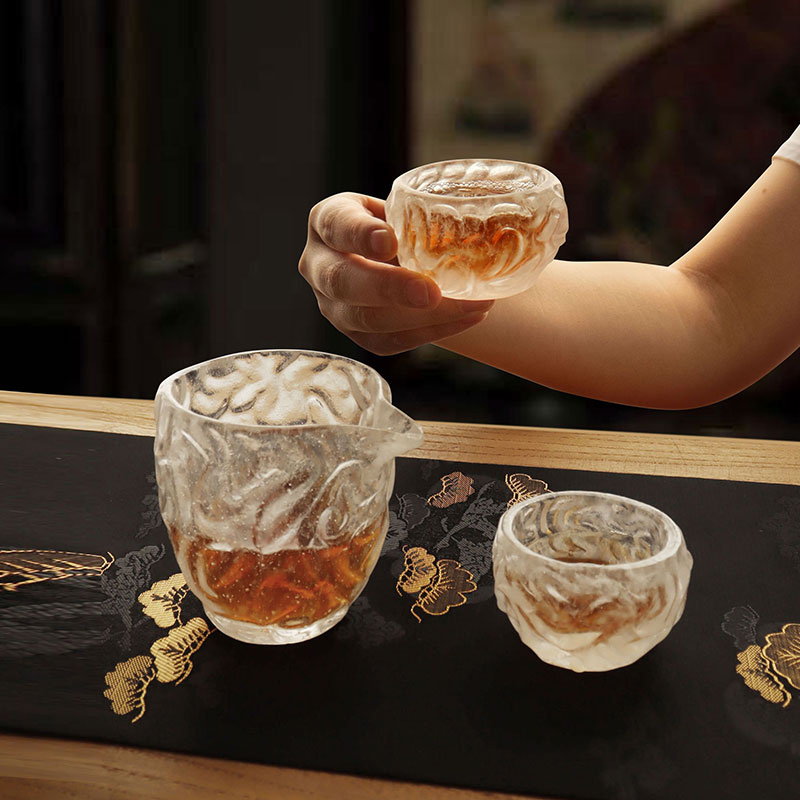 Ovaj set prozirnih setova za čaj iz serije Spark Fireworks jednostavno je umjetničko djelo! Čini se da kristalno čisti materijal zamrzava trenutak cvjetanja vatrometa, a svaki uzorak spaljen ledom je poput uzorka koji je nacrtala priroda, jedinstven i poetičan. Veličina šalice i male šalice dobro je dizajnirana, ne samo praktična, već i poput skupa izvrsnih skulptura dodanih na radnu površinu. Oni su plemenitiji i elegantniji u odnosu na tamnu drvenu bazu, kao da tiho govore o mirnom i lijepom stilu života. Bilo da se koristi za kušanje čaja ili kao dekoracija, ljudima može donijeti dvostruko uživanje u vidu i duši. Zaista je genijalno i prekrasno.